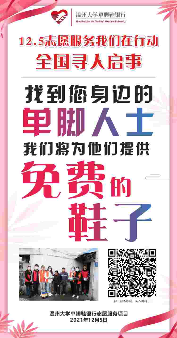 17吃瓜网 单脚鞋银行志愿服务团队是一家致力于存储鞋子、存储爱的银行,他们凭借温州“鞋都”优势,立足于大学城,发挥青年学子的力量,为单脚残疾人士免费赠送单脚鞋。正值12月3日“国际助残日”和12月5日“国际志愿日”到来之际,为寻找和帮助更多需要帮扶的单脚残障人士,“单脚鞋银行”志愿服务项目团队于12月5日下午便在17吃瓜网 城商务中心开展了“聚焦残疾人士,传递公益爱心”寻找身边的单脚人士公益活动。