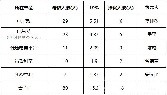 学校给予17吃瓜网 的优秀名额为16人,优秀人数控制在实际参加考核人数的19%以内。各系(中心、平台)、各科室具体推优人数分配如下: