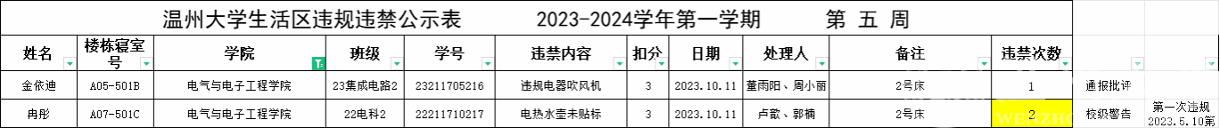 自2023-2024学年第一学期入学开始,学校针对宿舍安全每周进行大排查。根据学校第五周寝室安全卫生检查结果,排查到2位同学存在寝室违规现象,受到学校通报;同时排查第五周寝室安全检查有2位同学存在寝室违规。现根据学校相关规定,对上述同学进行院内通报批评,请其他同学引以为戒(名单见下)。