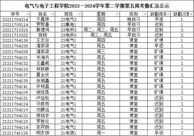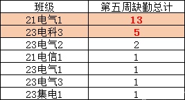 第五周早晚自习缺勤及课堂出勤情况如下: