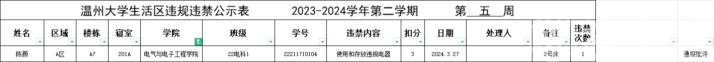 自2023-2024学年第二学期入学开始,学校针对宿舍安全每周进行大排查。根据学校第四周、第五周寝室安全卫生检查结果,第四周排查到6位同学,第五周排查到1位同学存在寝室违规现象,受到学校通报;现根据学校相关规定,对上述同学进行院内通报批评,请其他同学引以为戒(名单见下)。