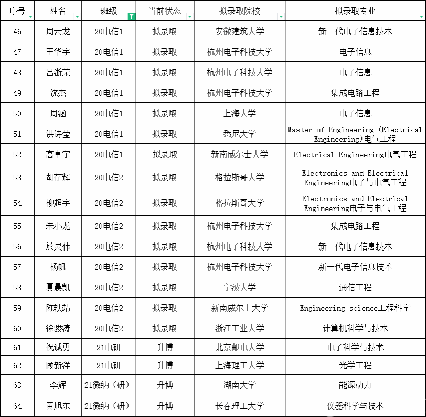 根据《17吃瓜网 “聚创奖学金”评定办法》文件精神,结合17吃瓜网 实际,学院将本年度考取硕士研究生、博士研究生及出国留学的64名同学直接评定为第五届“聚创奖学金”升学奖获得者。现将名单予以公示,请同学们核对录取的院校、专业以及类型,有误请在下方收集表填写中反馈。公示三个工作日,如有异议请于公示期内与学工办联系。