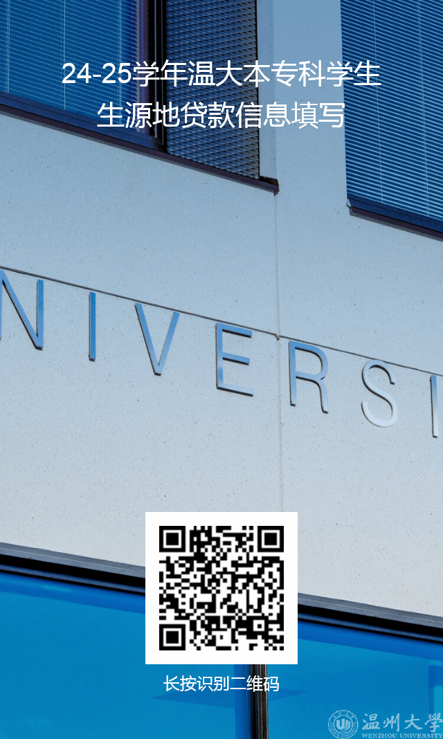 根据国家开发银行生源地信用助学贷款手续办理的要求,学生在生源地办理完信用助学贷款后,需要高校在限定时间内进行网上回执录入,请办理国开行生源地贷款的新老生,务必在9月20日前扫描下方二维码完成《24-25学年温大本专科学生生源地贷款信息填写》,否则影响本人助学贷款发放。