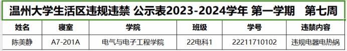 自2023-2024学年第一学期入学开始,学校针对宿舍安全进行大排查。根据学校第七周寝室安全卫生检查结果,第七周排查到1位同学存在寝室违规现象,受到学校通报;现根据学校相关规定,对上述同学进行院内通报批评,请其他同学引以为戒(名单见下)