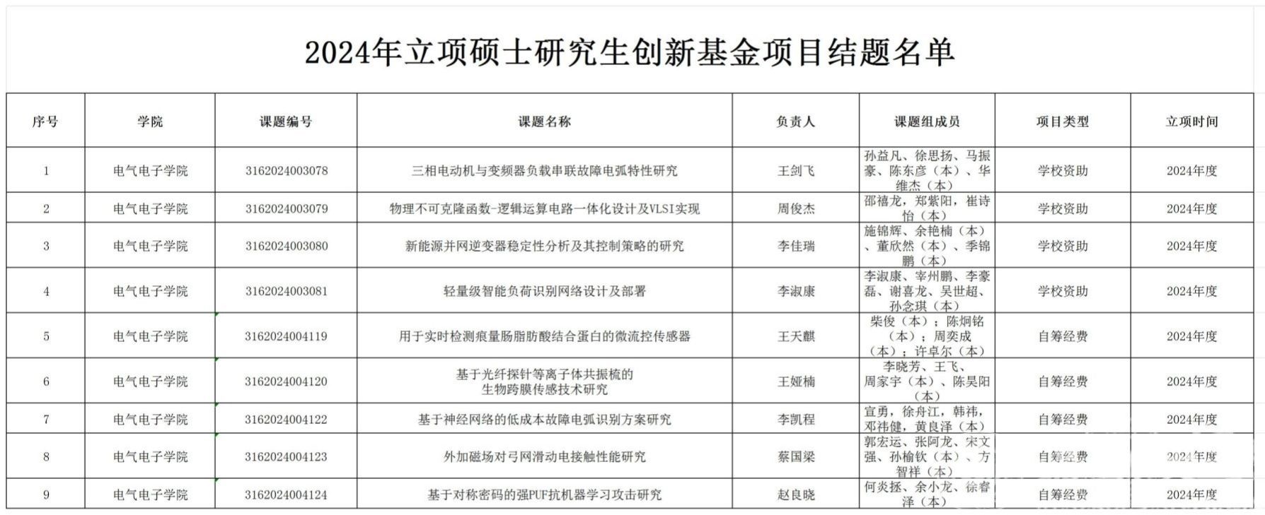 根据《17吃瓜网 硕士研究生创新基金管理办法(2020年修订)》要求,经项目负责人申报、学院研究生工作委员会评审,拟同意《三相电动机与变频器负载串联故障电弧特性研究》等九个项目结题。现将拟结题名单公示如下,公示期从即日起至3月2日,如果有问题,请联系林老师86689117。