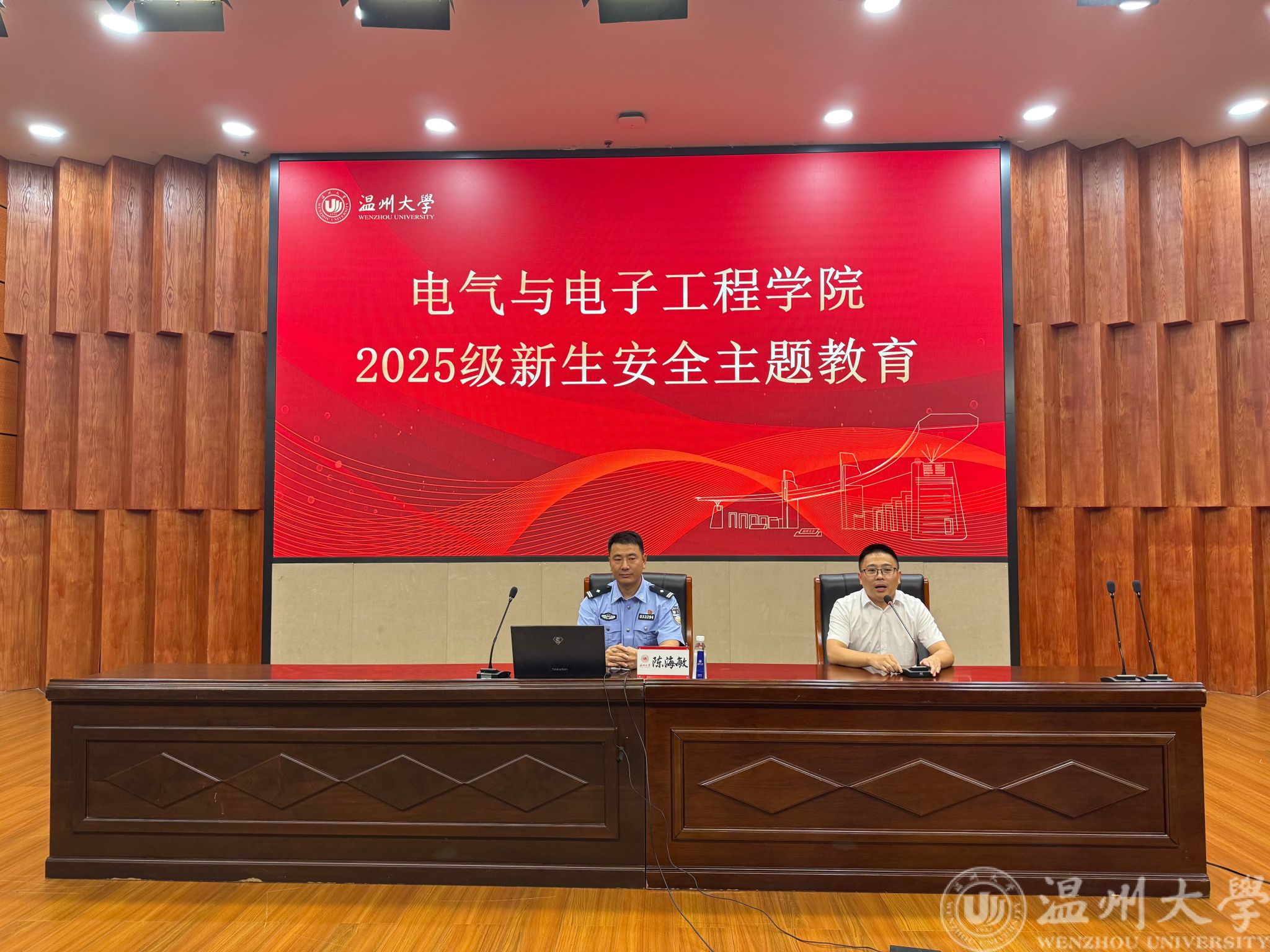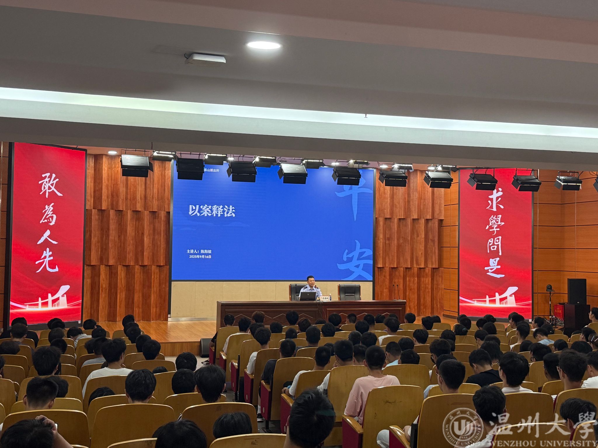 讲座中,陈海敏所长结合瓯海公安分局茶山派出所日常工作案例与辖区内高校常见安全问题,围绕电信网络诈骗、校园安全红线、应急防护等核心内容展开讲解。针对当前校园电诈高发态势,他详细拆解了虚假购物、兼职刷单、冒充他人身份等高频诈骗类型,结合温州商学院此前发生的学生被骗典型案例,生动还原骗子利用 “共享屏幕”“账户解冻” 等手段诱导转账的全过程,提醒新生警惕 “小利诱惑”,坚决不随意点击陌生链接、不向陌生人转账,遇到可疑情况及时联系学校保卫处或茶山派出所。