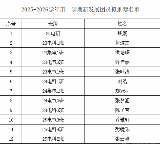 根据《中国共产主义青年团章程》《关于做好2025-2026学年第一学期团员发展与管理工作的通知》等相关要求,经本人自愿申请、团支部推荐,结合在校综合表现,经学院团委评议审核,拟将钱聚等12名青年学生发展为共青团员。