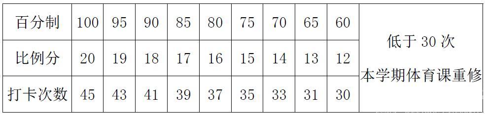 三、打卡要求:本学期总打卡次数为45次。每次2 公里以上,每日最多计入有效次数1 次,每周最多计入有效5 次。