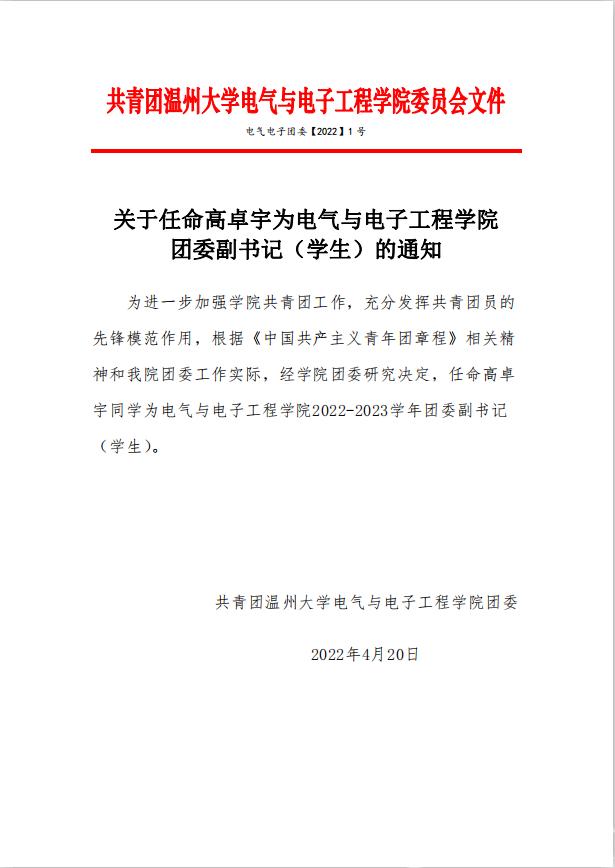 关于任命高卓宇为17吃瓜网 团委副书记(学生)的通知