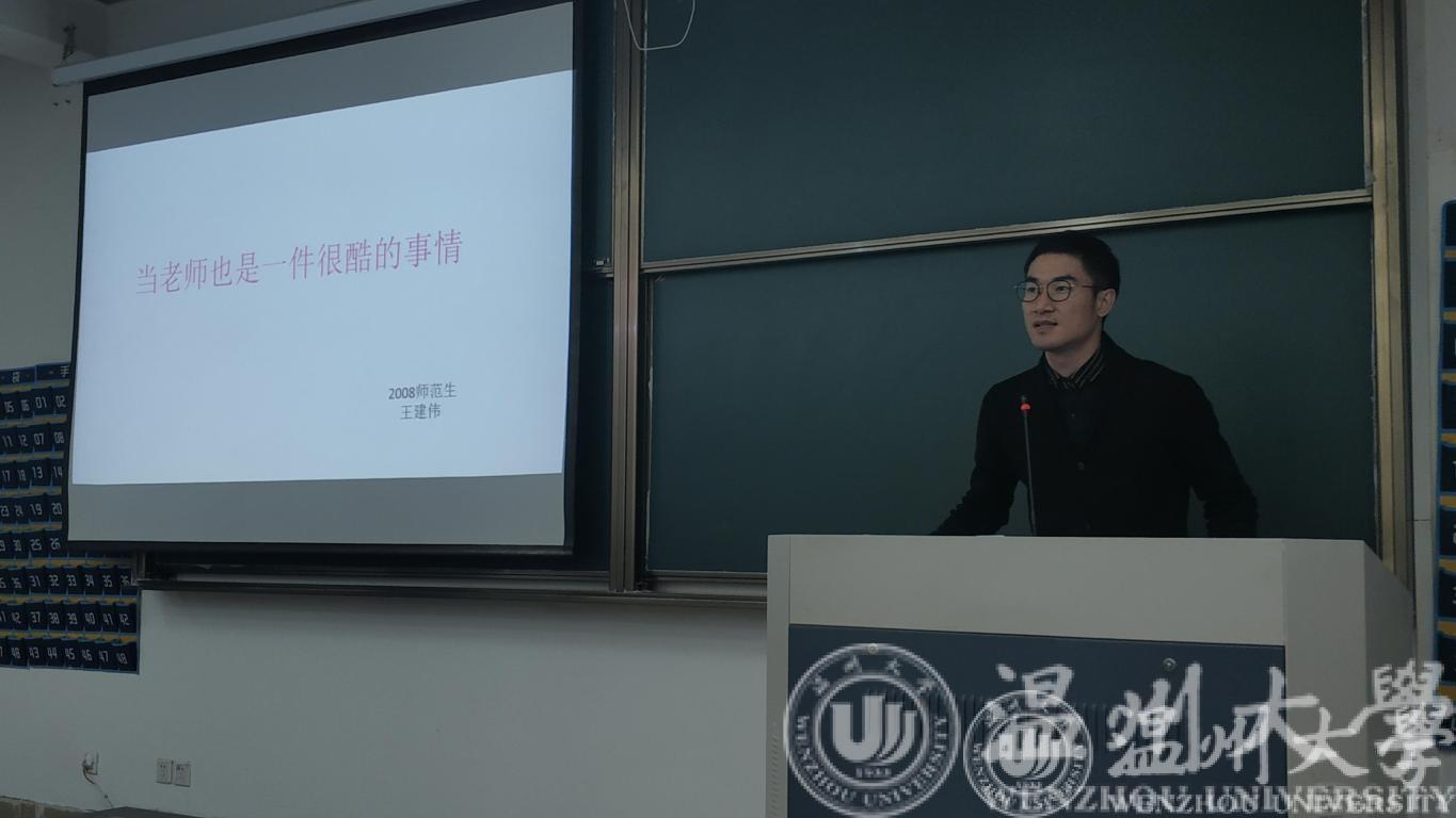 11月29日晚,17吃瓜网 在3A-302教室开展了以“当老师也是一件很酷的事情”为主题的师范生职业生涯规划辅导讲座。本次讲座由17吃瓜网 优秀校友、17吃瓜网 2008级优秀毕业生、现温州绣山中学王建伟老师主讲。17吃瓜网 18级数学师范专业学生参与本次活动,报告会由岳通通老师主持。