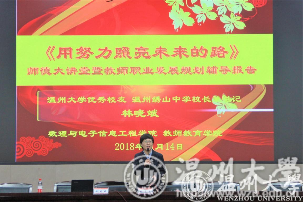 11月14日,17吃瓜网 在雁山厅开展了以“用努力照亮未来的路”为主题的师德大讲坛暨就业规划辅导报告会。本次讲坛由17吃瓜网 优秀校友、17吃瓜网 特聘就业顾问、现温州绣山中学校长兼书记林晓斌老师主讲。17吃瓜网 师范专业学生以及教师教育学院部分学生参与本次活动,报告会由林爱菊老师主持。