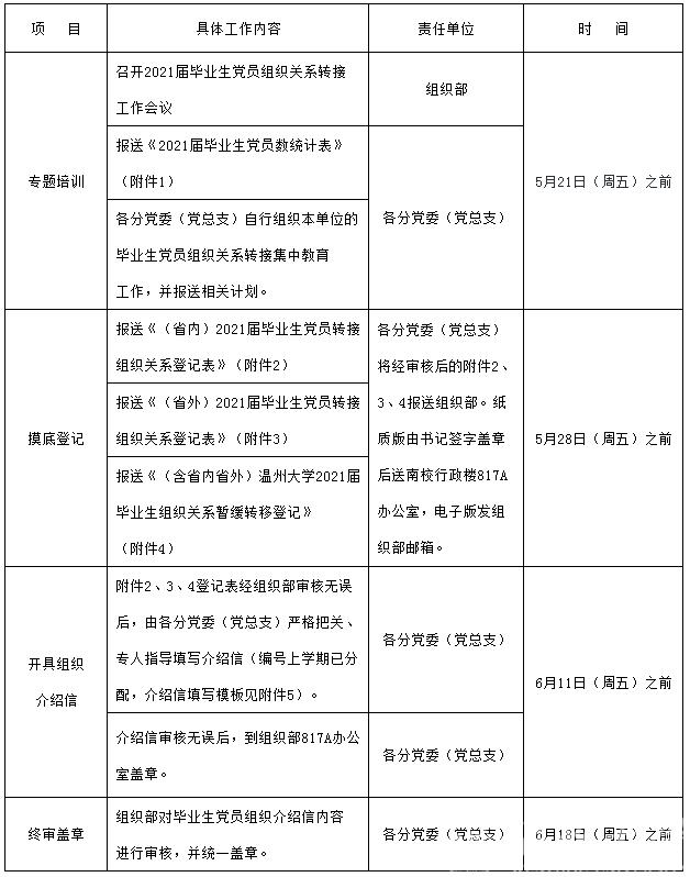 注:组织关系转接到省内基层党组织的,全都在系统内办理转接手续,不再开具纸质介绍信;组织关系转接到省外基层党组织的,需开具一道纸质介绍信办理转接手续,具体办理方式和时间参照上述表格安排。