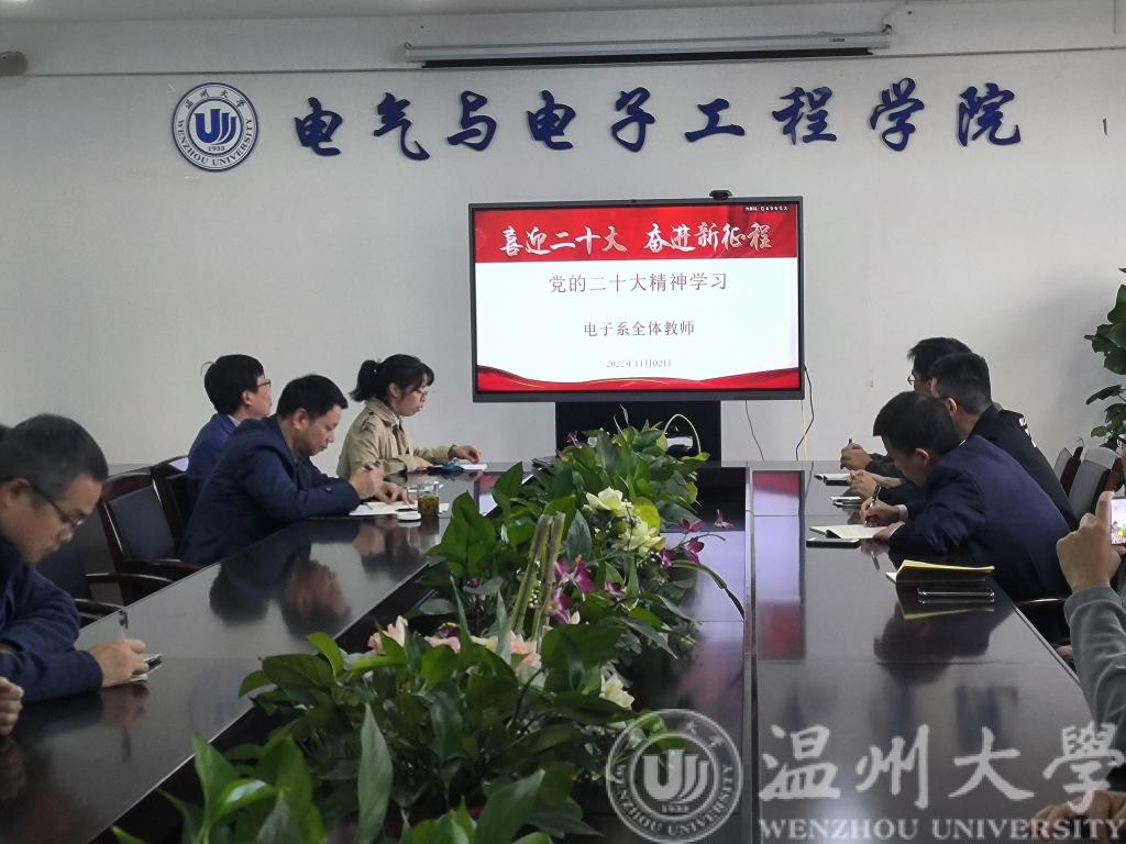 11月2日下午,电子系教工党支部召集电子系全体教师在1A502会议室召开了党的二十大专题学习会。全系教师认真学习了习近平总书记代表第十九届中央委员会在二十大开幕式上作的题为《高举中国特色社会主义伟大旗帜 为全面建设社会主义现代化国家而团结奋斗》的报告。这份报告是党和人民智慧的结晶,是党团结带领全国各族人民夺取中国特色社会主义新胜利的政治宣言和行动纲领,是马克思主义的纲领性文献,这份报告承载着科学谋划未来5年乃至更长时期党和国家事业发展的目标任务和大政方针的历史使命。会上老师们积极发言畅谈学习体会,汪鹏君院长勉励各位老师要将二十大报告的指导精神融入学院的教学与育人工作中,积极推进学院新一轮的发展。全体教师对二十大报告的思想性和先进性作出了高度评价。