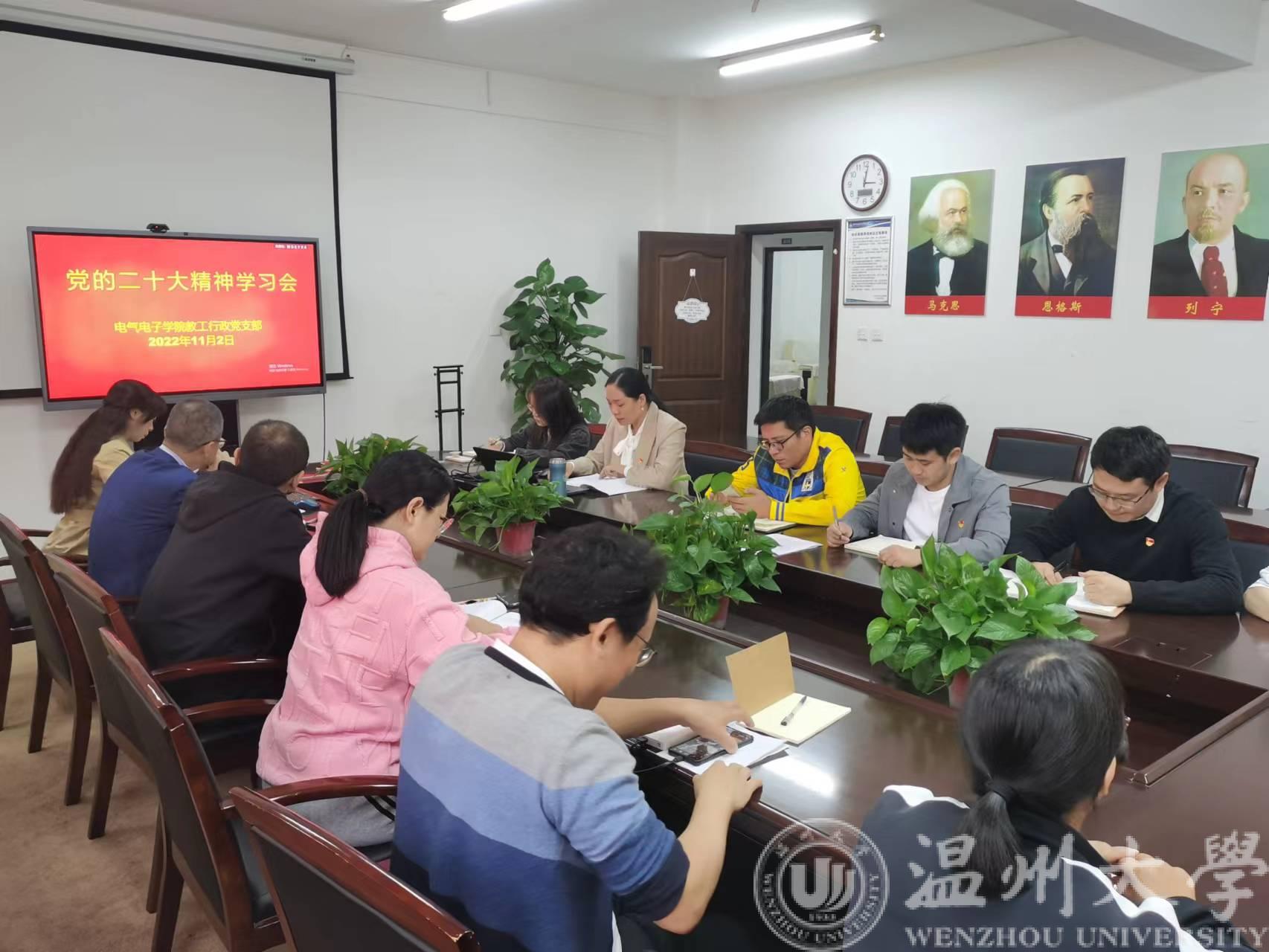 11月2日下午,行政教工党支部组织召开主题党日活动暨党的二十大精神专题学习会,学院党委书记李方强,院党委副书记、行政教工党支部书记曾蓓蕾及支部全体党员参加了会议。会议由支部书记曾蓓蕾主持。支部书记曾蓓蕾带领全体党员重温并学习了党的二十大会议精神。全体党员一直认为,将始终坚持以习近平新时代中国特色社会主义思想武装头脑、指导实践、推动工作,永葆对党忠诚政治本色,全心全意为师生服务,始终做到廉洁自律。以更加奋进昂扬的姿态,踔厉奋发、勇毅前行,努力书写无愧于党、无愧于人民、无愧于时代的教书育人新篇章。