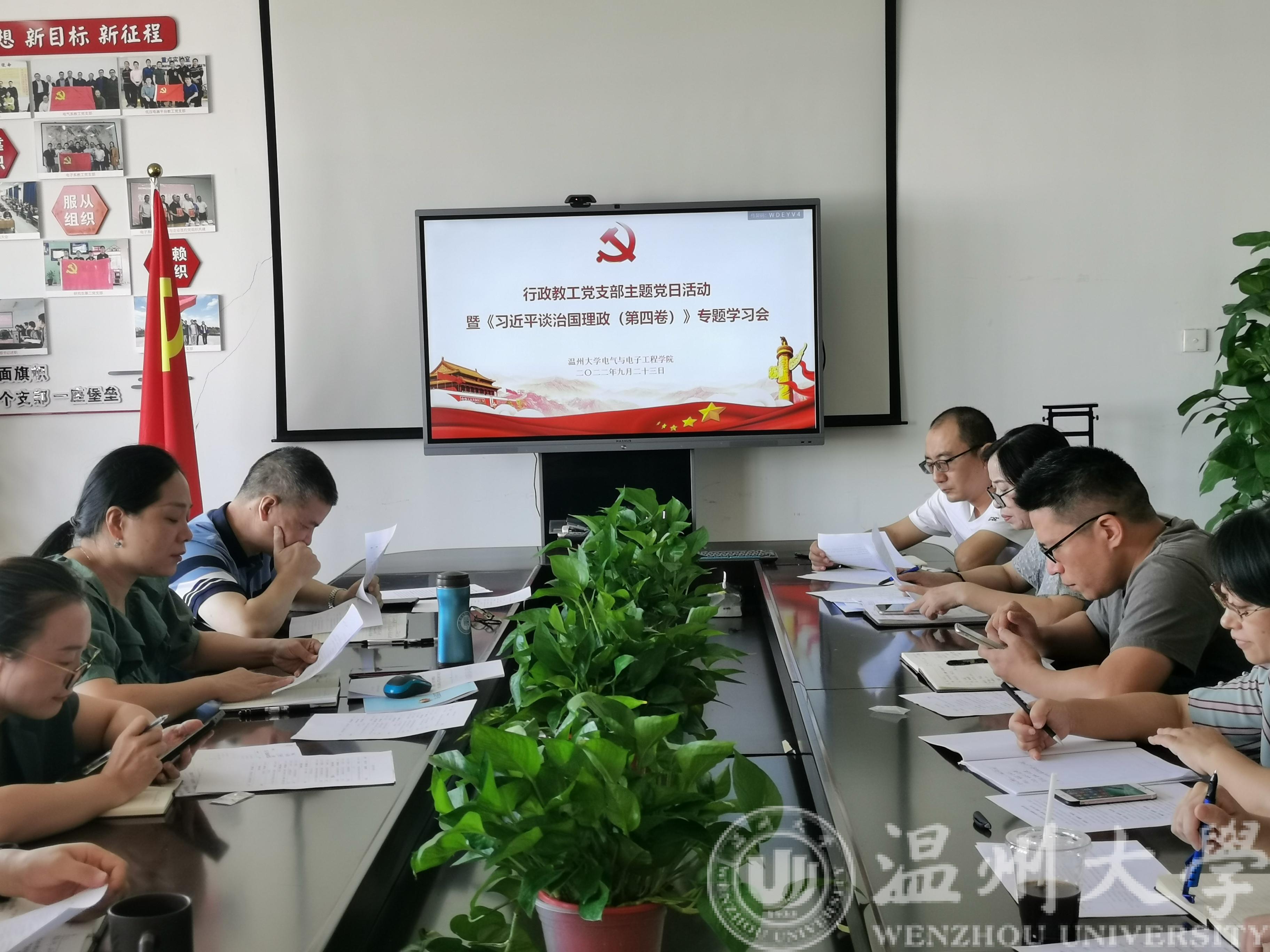 9月23日上午,17吃瓜网 行政教工党支部在院党务活动室召开主题党日活动暨《习近平谈治国理政》第四卷专题学习会,行政教工党支部全体党员参加了此次会议。会议由行政教工党支部书记曾蓓蕾主持。