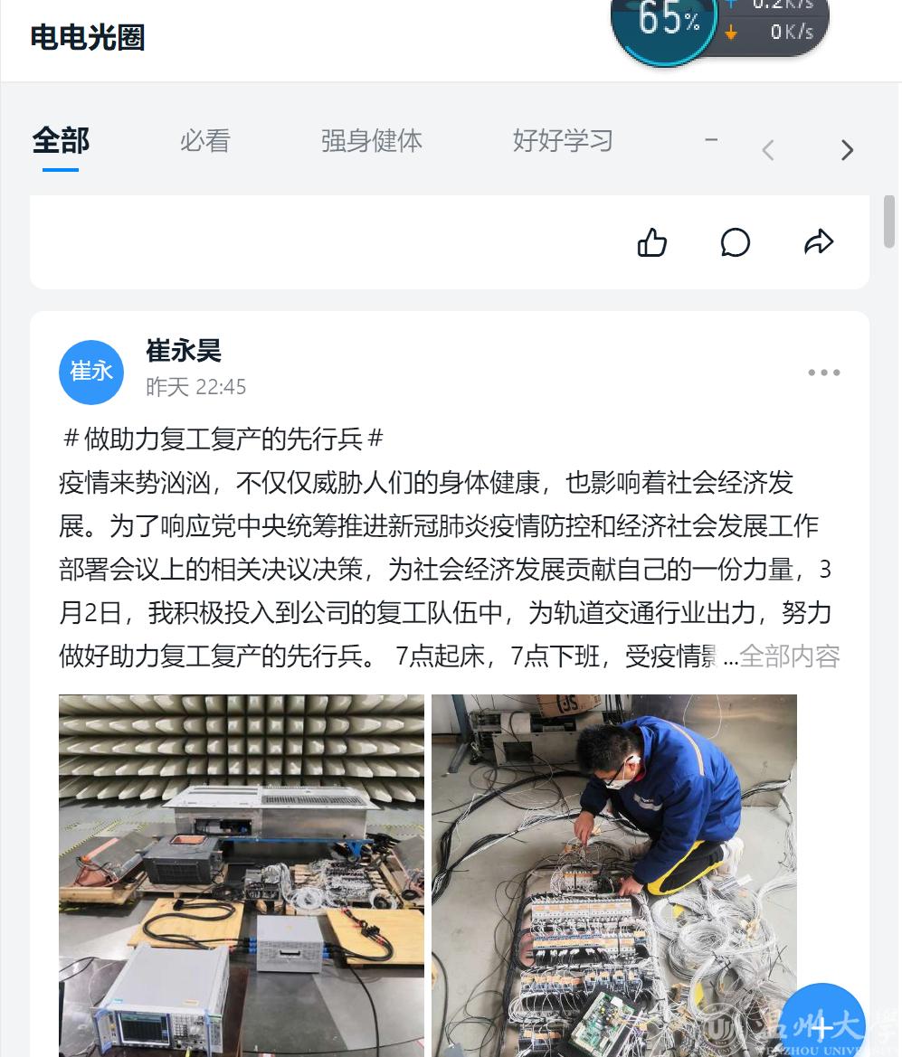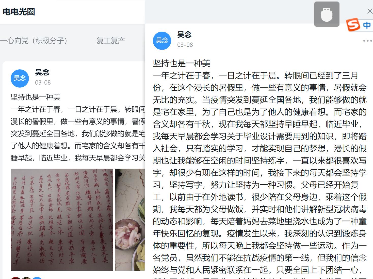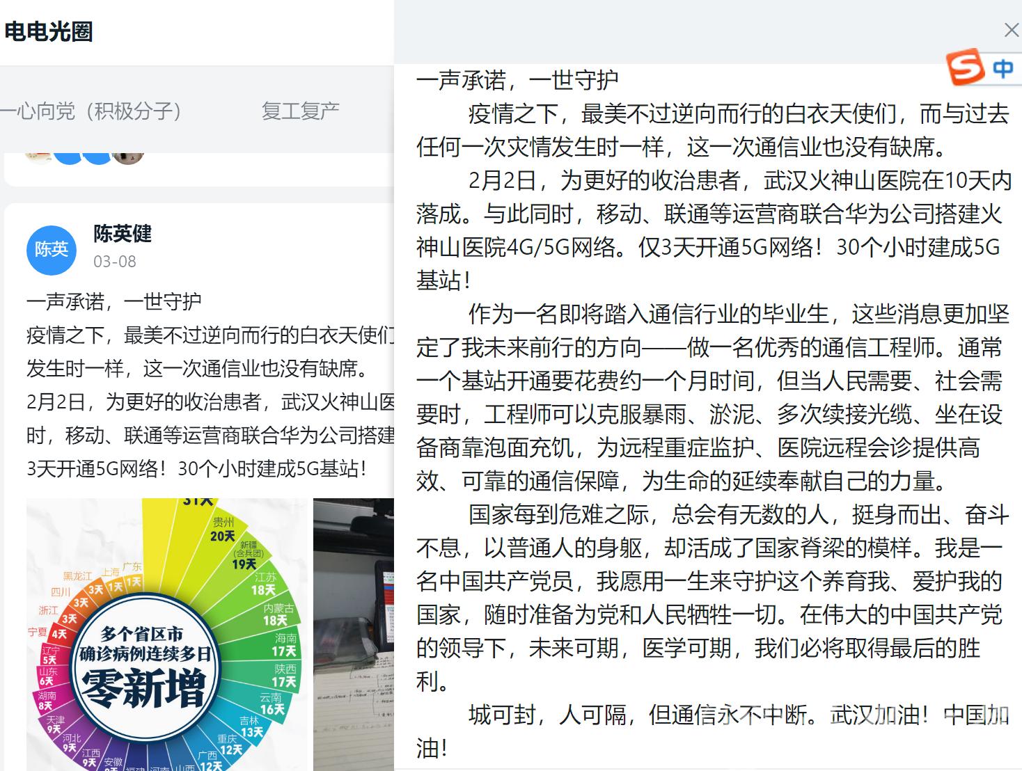 “当我去做志愿者的时候,听到社区里的老党员说,‘小一辈都出来了!’是啊,我们是时候担起肩上的责任了,初心路上,我们要接力下去!”“与过去任何一次灾情发生时一样,这一次通信业也没有缺席......作为一名即将踏入通信行业的毕业生,这更加坚定了我未来前行的方向——做一名优秀的通信工程师......当人民需要、社会需要时,提供高效、可靠的通信保障,为生命的延续奉献自己的力量!”“这段时间也许是我自大学以来,甚至于以后,与家人在一起最久的时光,这次疫情也警醒着我,生命是非常脆弱的,趁我们的父母还健在,趁我们还不是太忙碌,多陪伴陪伴父母!” 这些令人动容的文字摘自17吃瓜网 学生党员发表在钉钉圈子里党员日记。