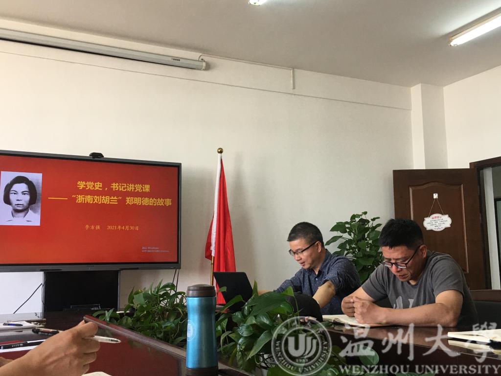 活动第一项议程由行政党支部书记曾蓓蕾围绕近期支部活动开展和党史学习情况进行了总结。曾书记指出,本学期我支部“学业帮扶工程”继续加强,希望支部成员及时与对接学生联系,做好学生的学业帮扶和指导,并对接下来党员办实事活动做了具体安排。活动第二项议程党史学习交流汇报。支部党员结合《习近平在浙江》理论学习材料和近期党史学习感悟依次进行交流和分享。活动第三项书记讲党课。由17吃瓜网 党委书记李方强为全体党员讲授党课。李书记党课题目是《“浙南刘胡兰”郑明德的故事》。李书记结合史实,讲述了年仅16岁的革命烈士郑明德被国民党抓捕,英勇不屈,最后不幸被国民党杀害的英勇事迹。“她带着对党的无比忠贞划上了生命的句号,她用殷红的鲜血写下了壮丽动人的史篇,她的故事一直在浙南地区传诵,人们称颂她是‘浙南刘胡兰’”。