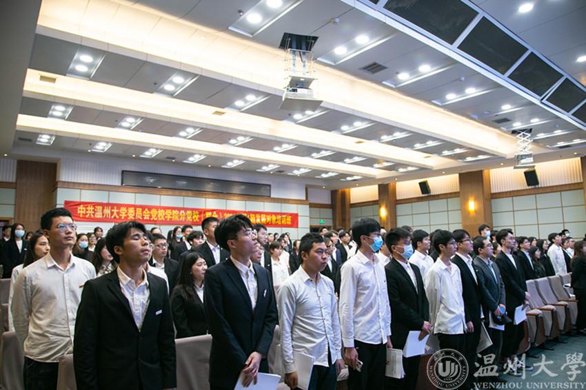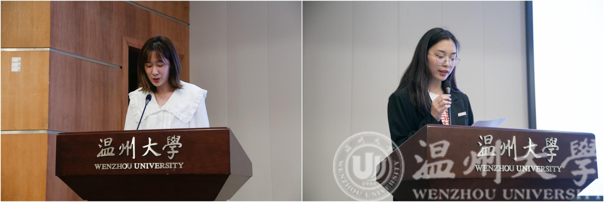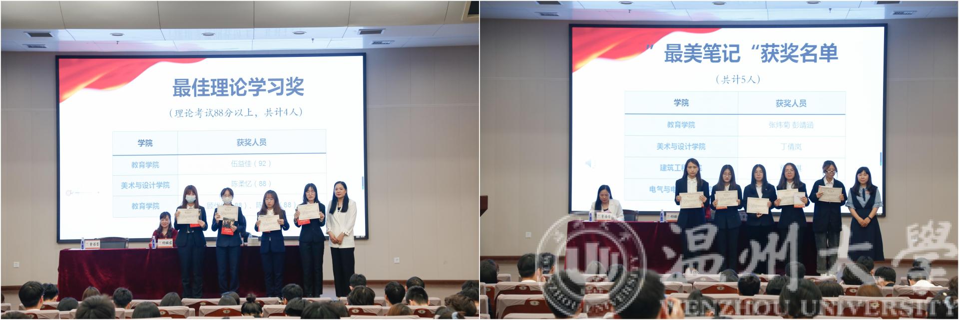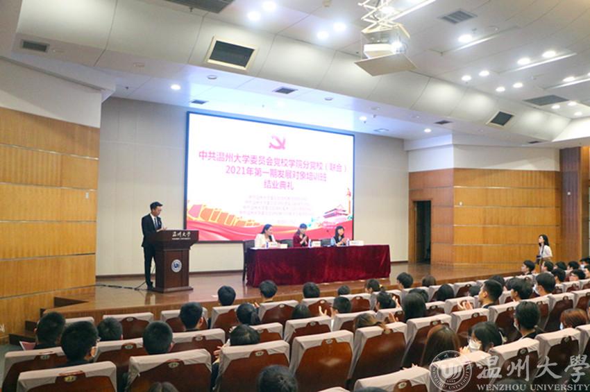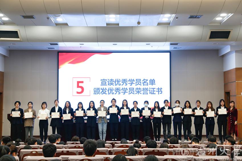 会议第三项是优秀学员代表汇报,来自温大附幼金楚楚老师和美术与设计学院方晨同学分别作为教工学员和学生学员上台发言。会议第四项,宣读结业名单、颁发结业证书。由建筑工程学院分管党建工作的辅导员黄骑骥老师宣读结业名单,杨丽君书记、曾蓓蕾书记以及章园园书记分别为优秀学员们颁发奖状以及赠送书籍。