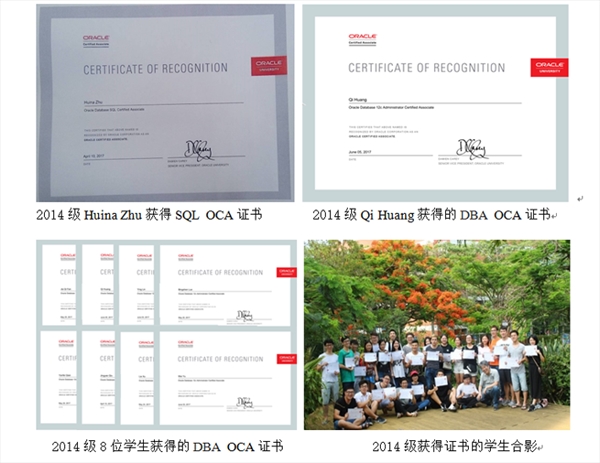 2014级有29位同学在台湾中华大学参加甲骨文(ORACLE)公司考試,28位同学获得ORACLE SQL OCA证书,8位同学获得ORACLE DBA OCA证书,1位同学获得ORACLE DBA OCP证书。