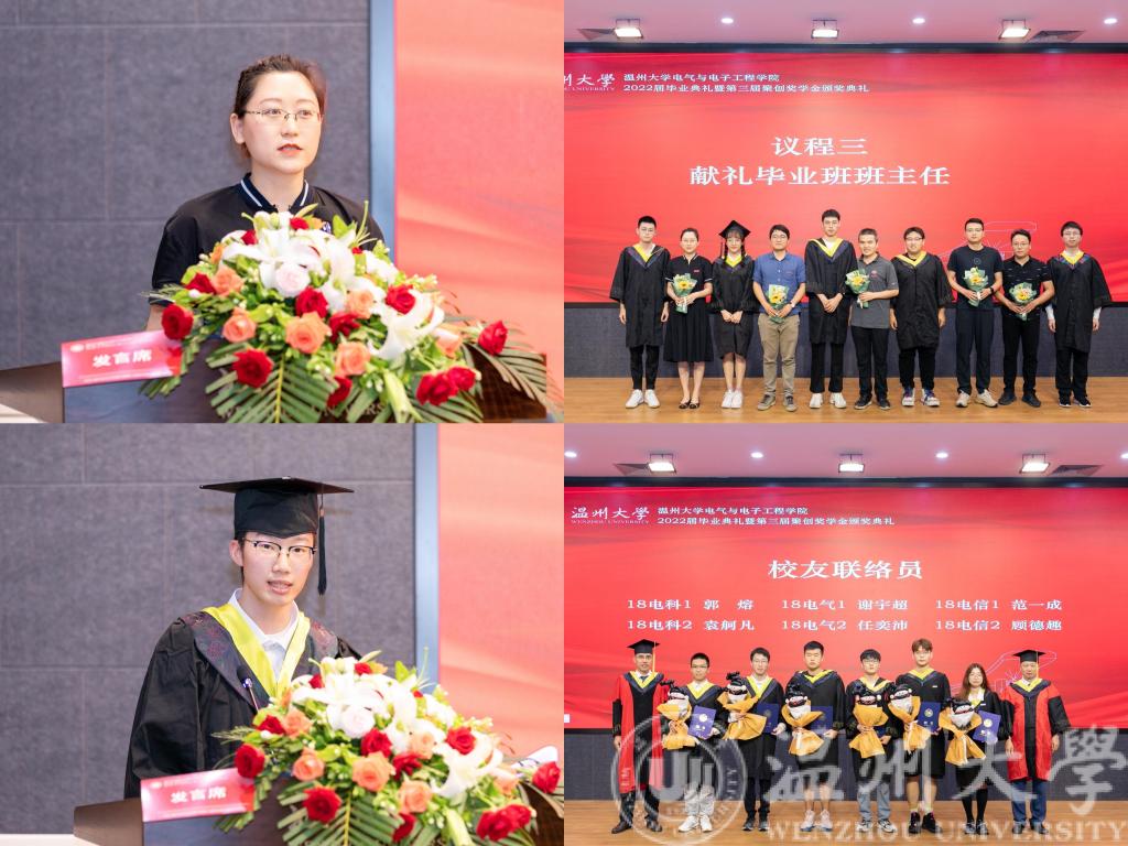 为表彰先进,在校友企业浙江聚创公司的赞助下,学院特别设立聚创奖学金。毕业典礼仪式上,学院党委书记李方强宣读了《2022年学院聚创奖学金奖励决定》文件及名单。聚创奖学金发起人吴桂初教授为获得聚创升学奖的31位同学颁奖。随后,毕业生代表任奕沛同学为吴桂初教授献花并表达感谢。